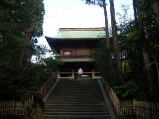 | 久しぶりの鎌倉詣でした。鎌倉に最初に行ったのは、小学校の修学旅行。昭和29(1954)年でしたが、季節は確か秋だったと思います。行く前に、音楽の先生から唱歌「鎌倉」を習い、何度も歌って覚えてしまい、そしていざ鎌倉、とばかりに乗りこんだのでした。多分江ノ島から始まって、稲村ヶ崎、大仏、鶴岡八幡宮を訪れたのを覚えています。61年ぶりの再訪です。その間、鎌倉の地には三回ほど足を運んではいるのですが、会議だったりのため、観光はせずに帰ってきていました。今回、思い立って鎌倉を見て歩いたのです。 今回の目的は、鎌倉文学館を覗くこと、いくつかの観光名所を回ること、宿で温泉に浸かること、の三つでした。 2015年11月18日、9時半頃に自宅を出て、鎌倉駅に降り立ったのは予定より半時ほど遅れ午後1時すぎ。昼食は、横須賀線内で済ませていたので、すぐに行動開始。 観光客で混み合う「小町通り」を抜けて鶴岡八幡宮へ。小町通りには、こじゃれた店が並び中学生や外国人が多い。途中に、聖ミカエル教会だとか、鏑木清方記念美術館とか、川喜多映画記念館(原節子のポスターもあると、あとから知った)などへの案内板があるが、いずれも今回の目的外、横目で見て通りすぎる。左に「山安」と暖簾を掲げた干物屋さんがあり、正面から来た広い道が右手に曲がっている。その角の向こう側が鶴岡八幡宮。右折して間もなく大鳥居がある。くぐって、太鼓橋を横目にしつつゆくとだいぶ先に舞殿が見える。 ![]() 鶴岡八幡宮(真ん中の○は何?) 「若宮堂の舞の袖、静のおだまきくりかえし」と唱われた舞殿。吉野山で義経と別れ、鎌倉に送られた静御前が義経を恋慕って唱った歌にちなむ唱歌「鎌倉」五番の歌詞である。その先に、大階段。その向かって左に、平成22(2010)年3月10日の大風で倒れた大銀杏の根株が眼に入る。倒れたあと、堀あげて隣に移したと看板が教えてくれる。階段を上りはじめると、すぐ脇に銀杏の立っていたあとが平らに均されていて、赤い柵の脇に銀杏の幼木。倒れた銀杏の根株から自生したものとのこと。親木は樹齢1000年とも言われたが、生命力の逞しさを示している。 ![]() 大銀杏の根株(右中央)と幼木(赤い柵の陰) 上を見ると急な階段が上までつづく。連れ合いは、10年ほど前に鎌倉に来ているのだが、八幡様ははじめての由、小生にすがって上まで登る。お参りを済まして入り口の鳥居まで戻ると、結婚式を挙げたのか、白い角隠しをしたお嫁さんが新郎、親族と記念写真を撮っていた。 次は、鎌倉文学館へ。雨模様になりひとつぶ、ふたつぶの雨が、薄くなった毛を通して頭皮にあたりはじめたので、タクシーに。若宮大路を南下し鎌倉駅のそばを通過、釣り針型のコースを辿り、大きな木々に囲まれた鎌倉文学館に到着。空がだいぶ暗くなっていて、照葉樹に被われた切石路は暗くなっている。木戸銭を払い短かなトンネル(?)を抜けて玄関へ着くと、車寄せのある立派な玄関。内部は、紅い絨毯が敷かれ、土足厳禁。ステンドグラスが填められている窓もある。目下、「鎌倉文士 前夜とその時代」という特別展が開かれている。開館30周年記念と銘打っている。 ![]() 鎌倉文学館の玄関 鎌倉には、昭和になった頃、大佛次郎、久米正雄、里見クなどが住んでいたのですが、そこに小林秀雄、林房雄、深田久弥、川端康成らが引っ越してきたのだそうです。「文學界」という雑誌を発刊し、それで、鎌倉文士といわれる集団が形づくられたわけです。昭和11年には「鎌倉倶楽部」なる集まりができ、鎌倉カーニバル、鎌倉ペンクラブ、鎌倉文庫という貸本屋、鎌倉アカデミアなどが次々と企てられました。この企画展では、そうした動きを写真、色々な作品の原稿、貸本屋の看板などといった現物、等々、色々な資料でたどることができました。その中で、逸品は、島崎藤村の「夜明け前」の冒頭の原稿、小林多喜二「蟹工船」冒頭の原稿でした。藤村の原稿は、旧字で書かれているので、所々、読むのに想像力を要します。多喜二の原稿も一行目の「おい地獄さ行くんだで」が目に残ります。そのほか、文士たちの、互いに切磋琢磨した様子、鎌倉の皆さんとの交流なども紹介されておりました。戦時中の苦悶の一端も垣間見られます。 この建物、先ほども書いたように、実に立派な作りと素晴らしい立地に建てられています。この日は,生憎、雨模様で、ひととおり見終わっても雨が激しくふり庭に降りられませんでしたが、ベランダからは広壮な庭を眺められたし、木々の向こうには相模湾が望めるだろうと想像できました。この敷地建物は、前田侯爵の別邸だったのだそうです。前田侯爵といえば、かつての加賀百万石の殿様、東京駒場にある旧前田侯爵邸が思い浮かびますが、こんなすごい別邸をも持っていたのか、とビックリポンです。連れ合いは二度目の訪問で、前回はバラ園もみたのだそうです。 雨のなかを小半時歩いて、江ノ電由比ヶ浜駅を経由し、今宵