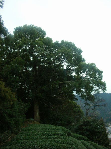 | 頂上近くには、周回道路も行かない。農作業用の細道をミカン畑や茶畑を抜けて頂上に到達すると、あの楠がある。 小さな頃から、下界で眺めていた楠を今、身近に見ることができる。幹に触ることも出来る。何十年間、下から見るたびに、あそこに登れる日があるのだろうか、と思ってきた。ここに立った時は、ちょっとした感激であった。 |