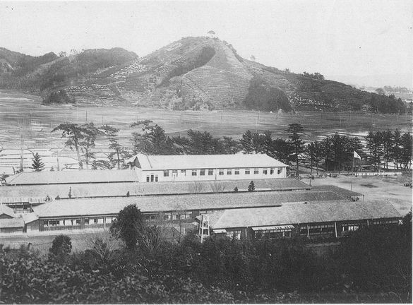 この写真も、100周年アルバムからお借りした。昭和12年頃の写真であるが、私の通っていた頃と校舎の並びや風景など、とてもよく似ている。街道から、山の辺まで一面の田圃、というのもその通りであった。佐渡山頂の楠は、一本、凛々しく立っている。 グラウンドの向こう側、松の木の陰に家が見える。私がいた頃、ここに文房具屋さんがあった。そこの親爺と、うちの親爺とは、たしか、あまり仲が良くなかったようだ。そんな記憶があるのである。 |