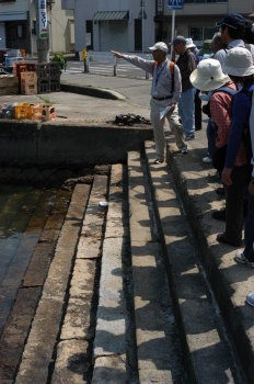 | オレンジのリュックがボランティアガイド氏。左側で川をのぞき込んでいる目線の先が、上の写真。 | |