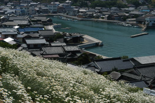 | 振り返ると港と家々が除虫菊の向こうに。 | |