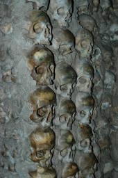 ポルトガルのエボラという町の聖フランシスコ教会の人骨堂の壁の写真です。ここは、修道士がシャレコウベに囲まれて瞑想するためのお堂なのだそうです。私には、そんなことは全く想像できないことでした。そこでは修道士が、私たちのように、思わず合掌したりも、ギョッとしたりもせず、心静かに瞑想するのだそうです。 (2003.10.20) |